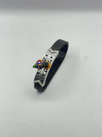 The bracelet features an intricately crafted Shreenathji (Lord Krishna) motif highlighted with rich multicolor enamel detailing, symbolizing devotion, joy, and divine blessings. The elegant silver design is paired with a black stretchable band, offering a perfect blend of tradition and modern style.