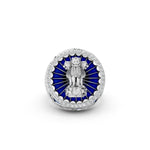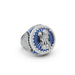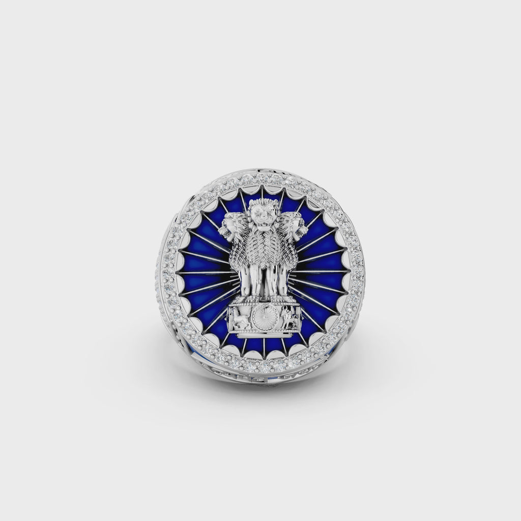 This finely crafted ring is made from pure 925 sterling silver and features a detailed Ashoka Lion Capital design inspired by India’s national emblem. The centerpiece is highlighted with deep blue enamel work arranged in a radiant circular pattern, bordered by a layer of clear stone settings that add depth and contrast to the design.