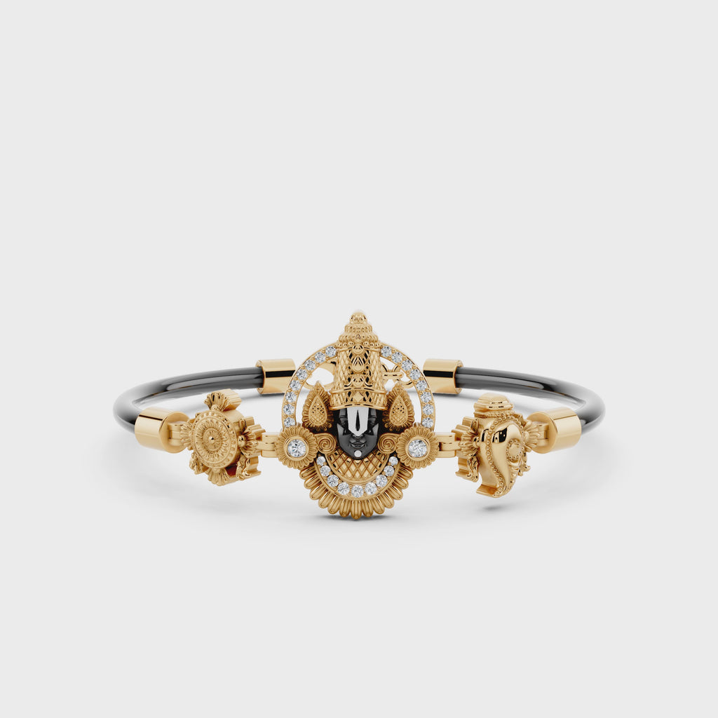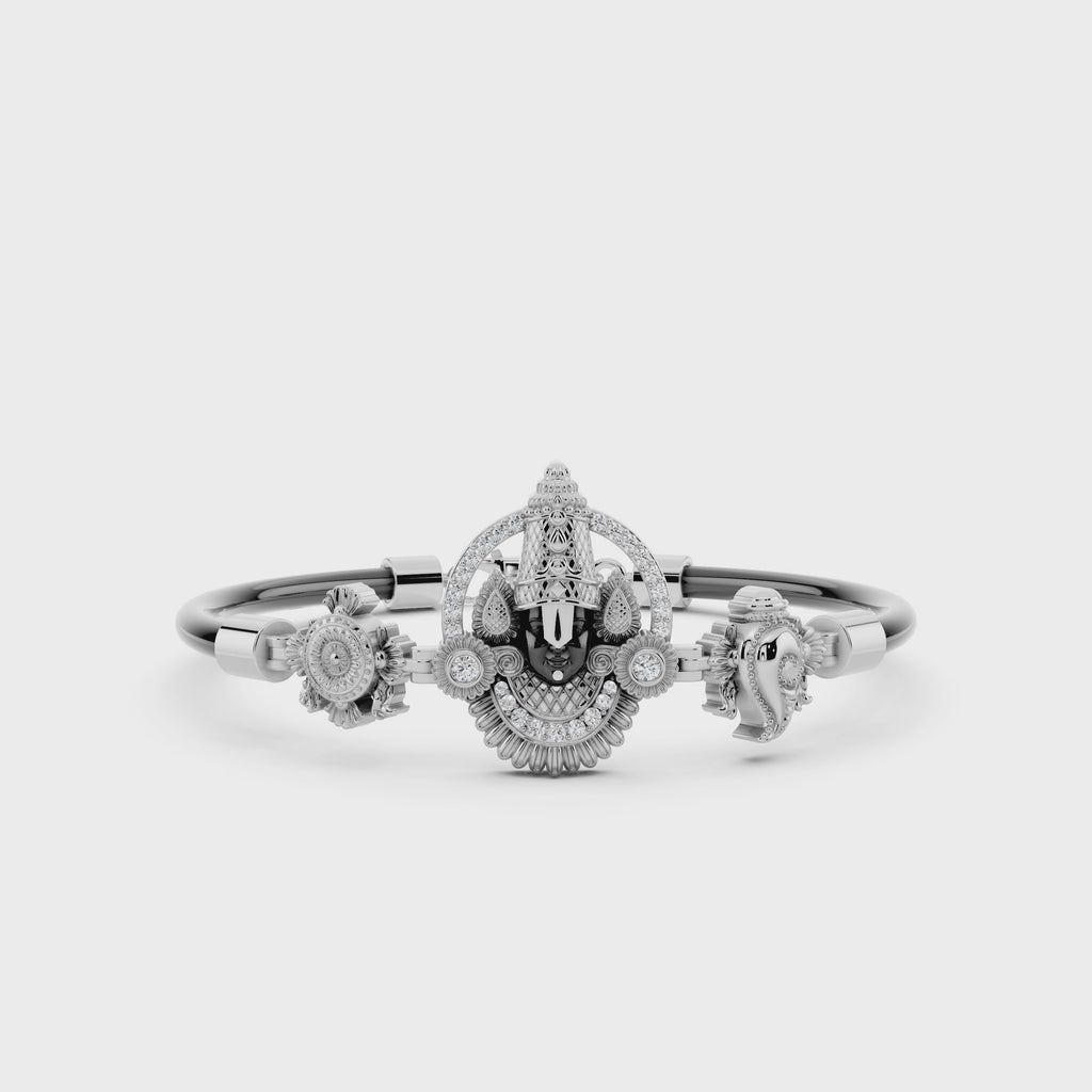 This finely crafted 925 sterling silver Tirupati Balaji bracelet is designed with detailed divine motifs that reflect traditional Indian artistry. The centerpiece features a sculpted Lord Venkateswara (Balaji) face finished in a deep black tone, surrounded by intricate gold-polished silver work and accent stones that enhance its spiritual presence. The bracelet is completed with a sleek black band for a balanced blend of devotion and contemporary style. Made from hallmarked 925 silver, it is suitable for daily wear as well as special religious occasions, making it a meaningful addition to any jewellery collection.